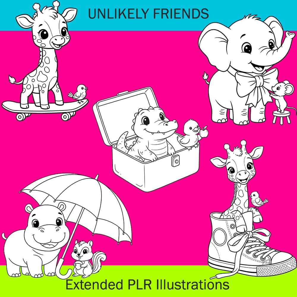 Unlikely Friends is a ready-to-use pack of 125 black-and-white coloring book characters featuring sweet animal duos in playful, kid-approved scenes. Clean outlines, big open spaces, and an instantly cohesive style across the whole set.